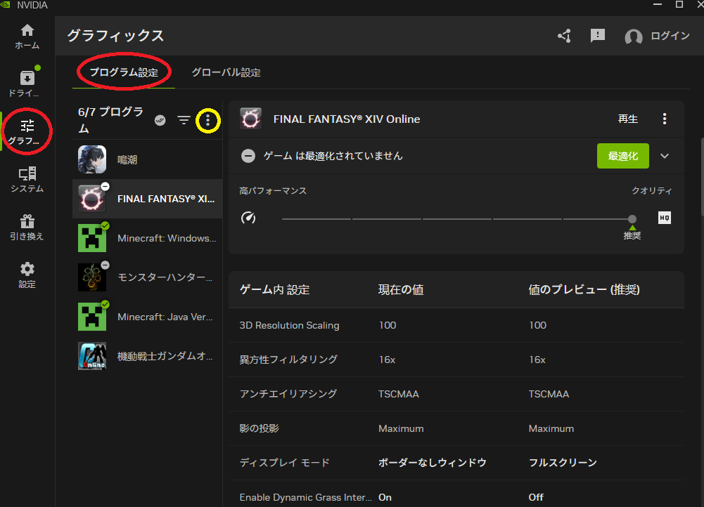 NVIDIA公式ページからNVIDIA Appをダウンロードした後、トップ画面から「グラフィックス」を選択して「プログラム設定」のタブに合わせます。一覧にApexがない場合は画像の黄色の〇の箇所をクリックしてアプリを追加してください。