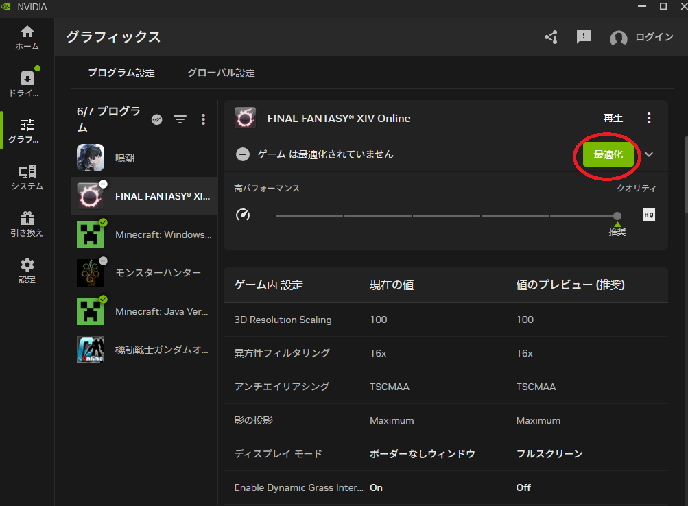 最適化ボタンを押すと、自分のゲーミングPCのスペックに合わせて自動的にグラフィック設定を調整してくれます。