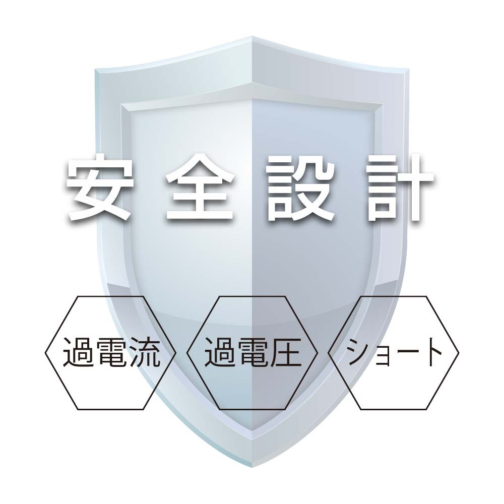 保護機能の「過電流保護」「過電圧保護」「短絡(ショート)保護」を搭載し、高い安全性を備えています。過電流・過電圧・短絡(ショート)発生時に動作を止めることで、万が一の事故を未然に防ぎます。