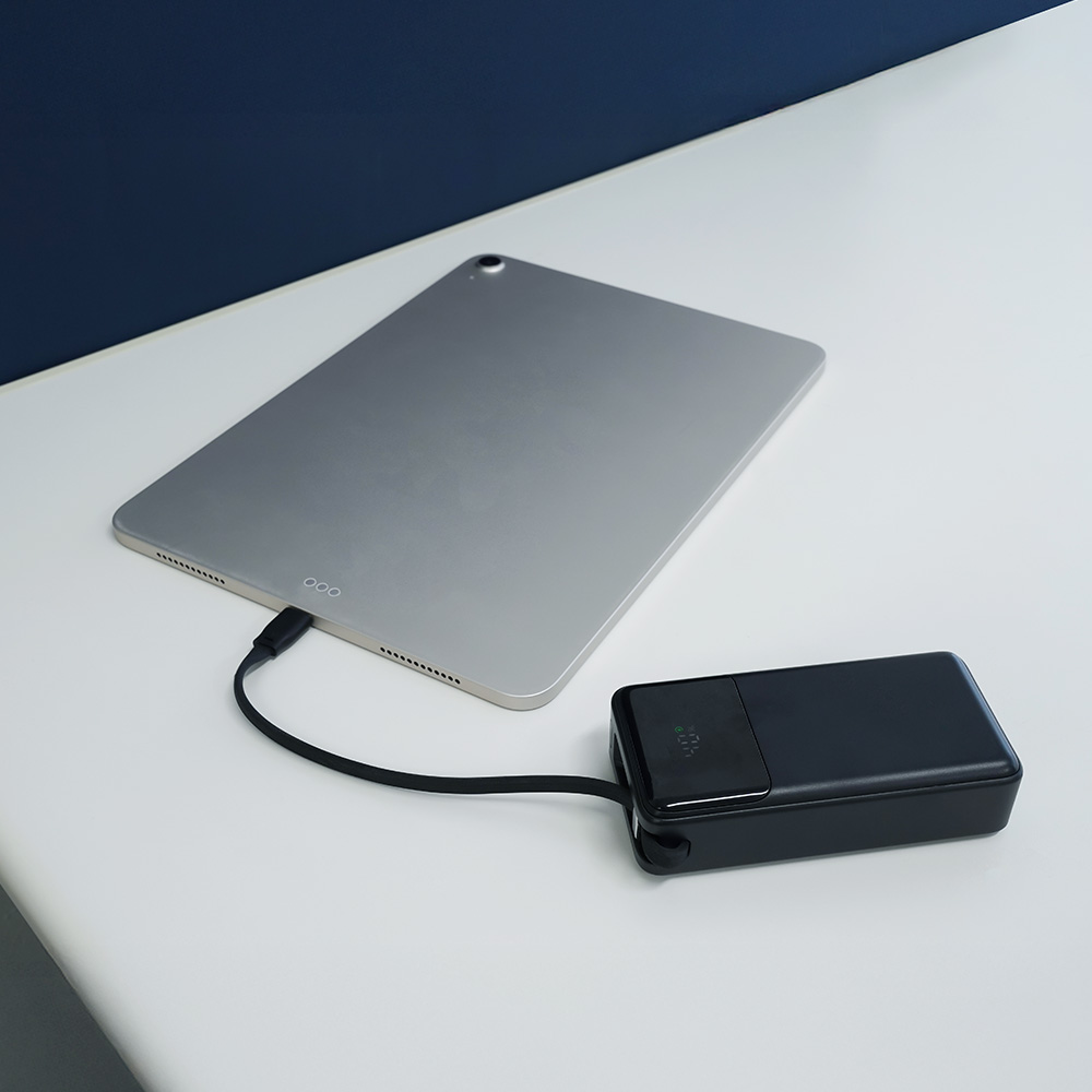 一体型ケーブルと搭載ポートはUSB Power Delivery(PD)に対応しており、最大30W充電に対応。スマートフォンやタブレットを充電でき、本製品にも急速充電が可能です。