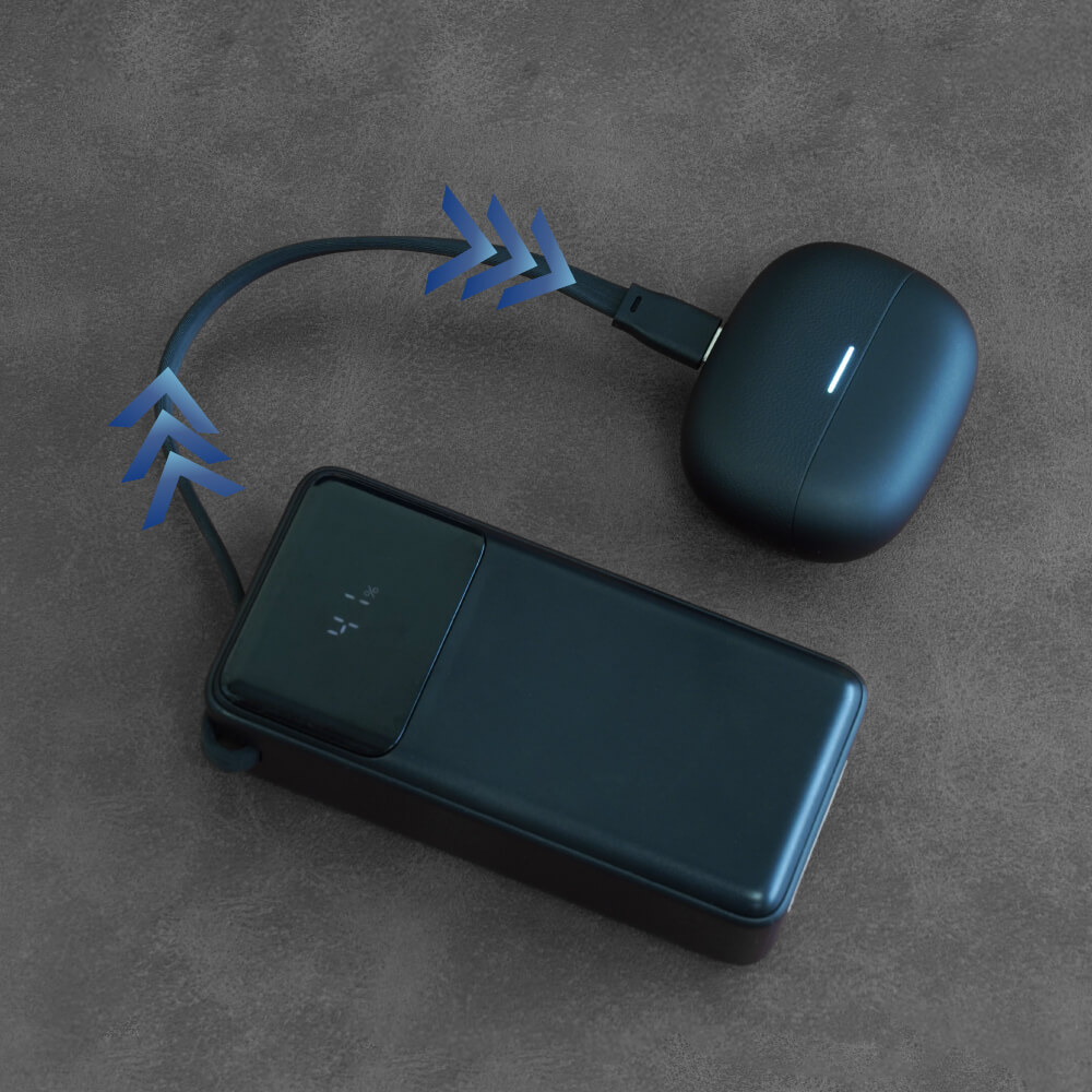 本製品はケーブル一体型の10000mAhモバイルバッテリーです。本体とUSB Type-Cケーブルが1つになっており、ケーブルを持ち歩かずに充電ができます。一体型のUSB Type-Cケーブルは約21cmで、充電中も邪魔にならない長さです。