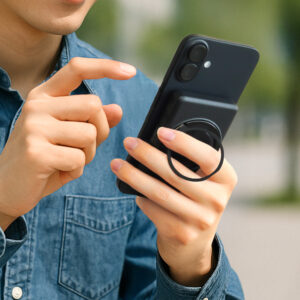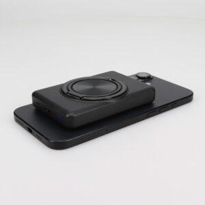 マグネット式でスマートフォンに吸着して、手持ち時の落下防止や、スマホスタンドにもなる。