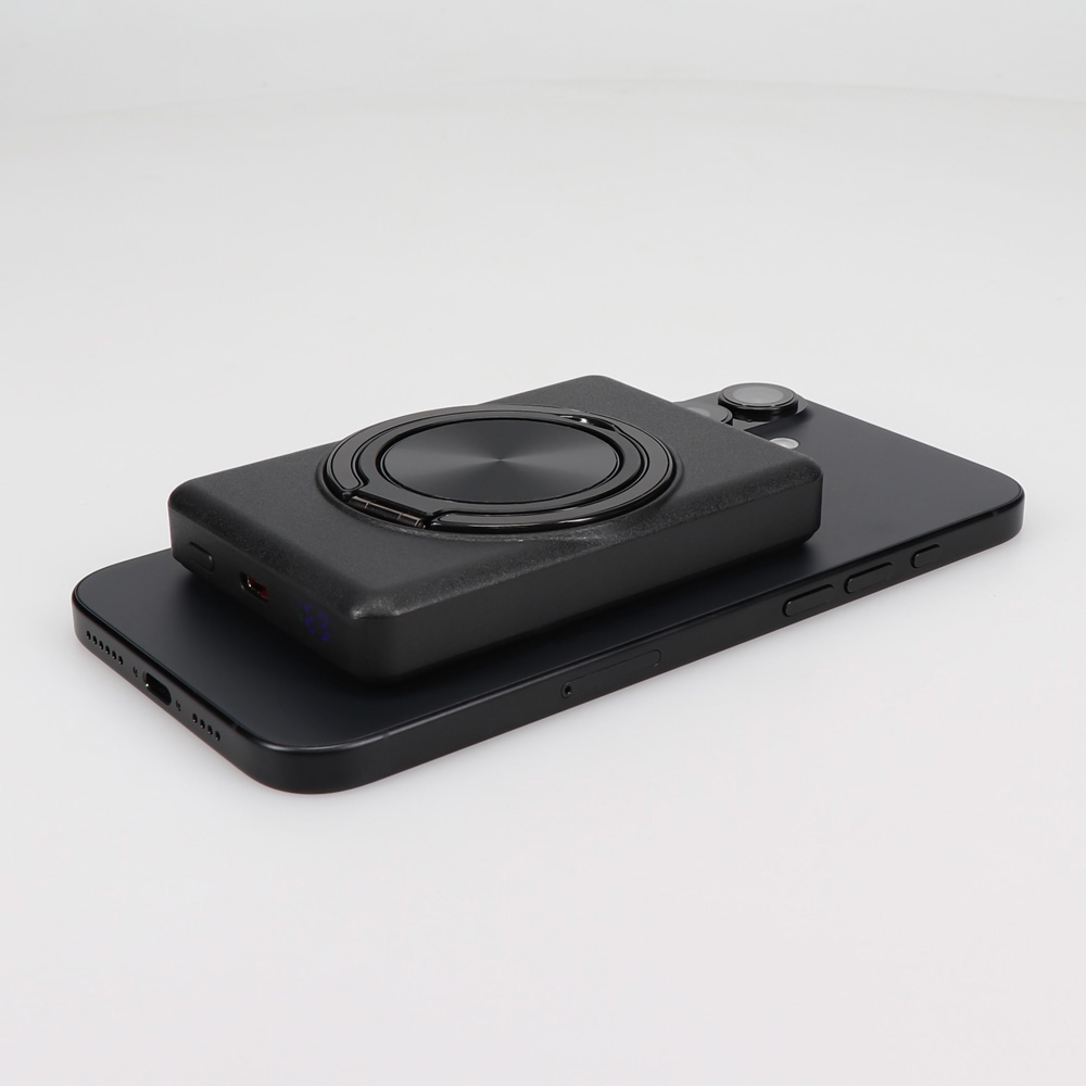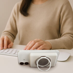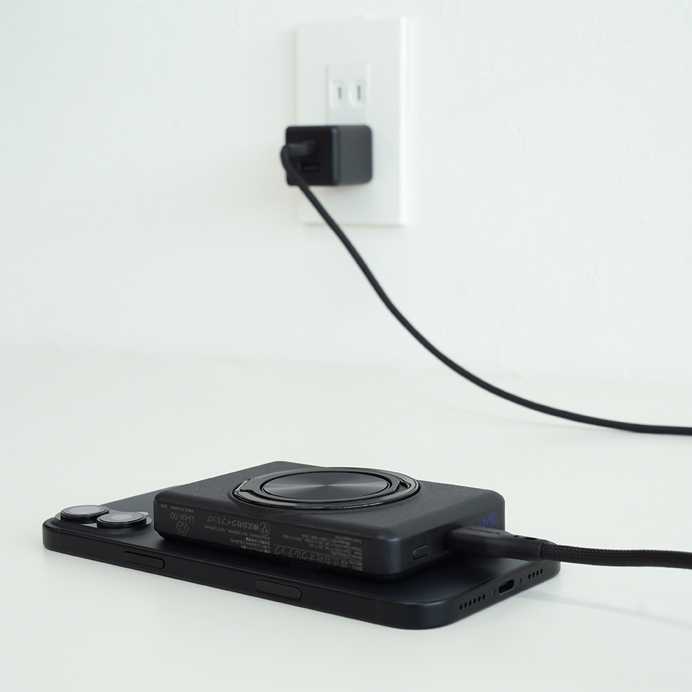安全性に優れる「準固体電池」を採用した、ワイヤレス充電対応モバイルバッテリーです。スマホリング一体型で、充電中も安定した状態でお使いいただけます。