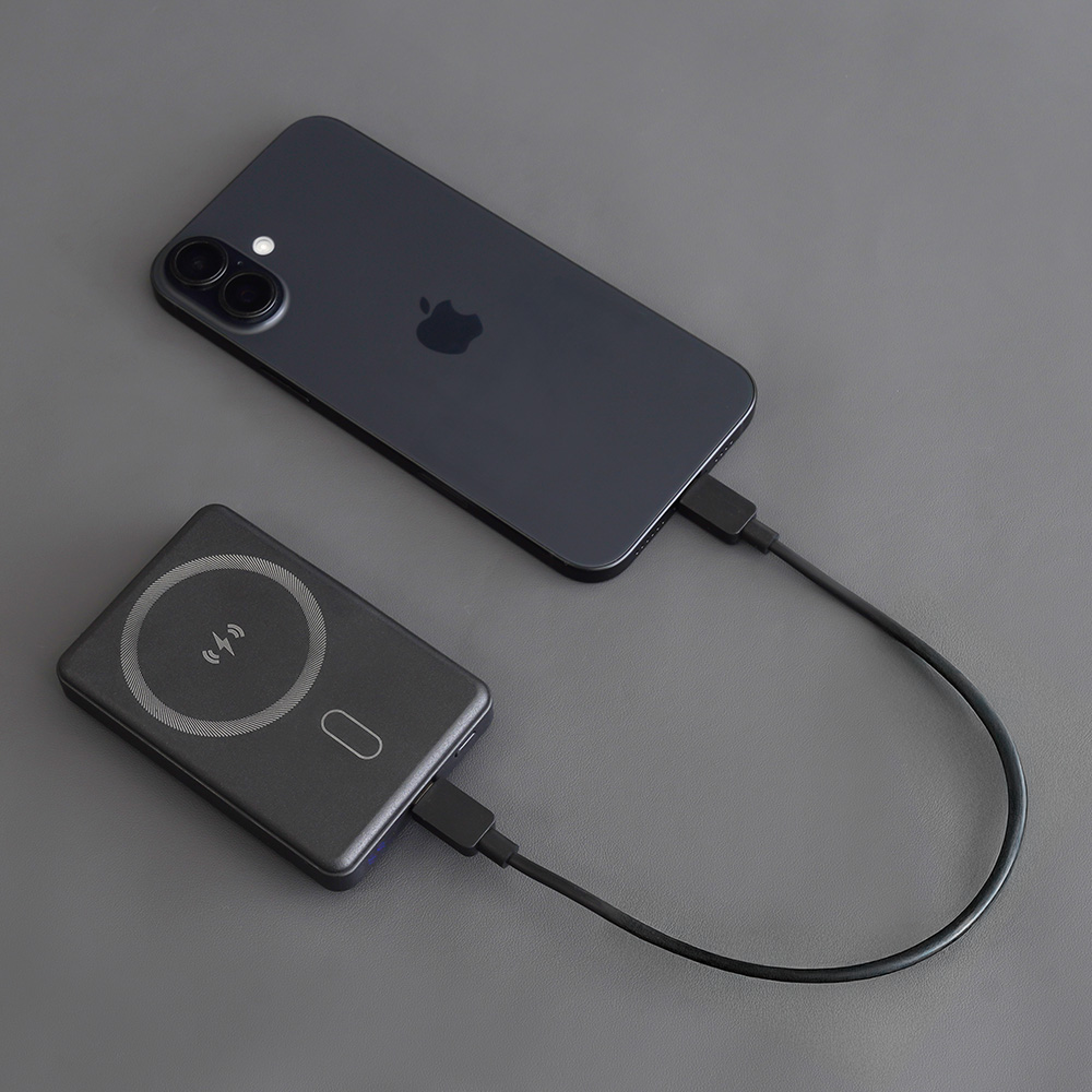 Qi2やMagSafe対応機器では最大15Wでマグネット吸着によるワイヤレス充電ができます。また、Qi2やMagSafe非対応のワイヤレス充電対応機器においても、機器に応じたワイヤレス充電が可能です。