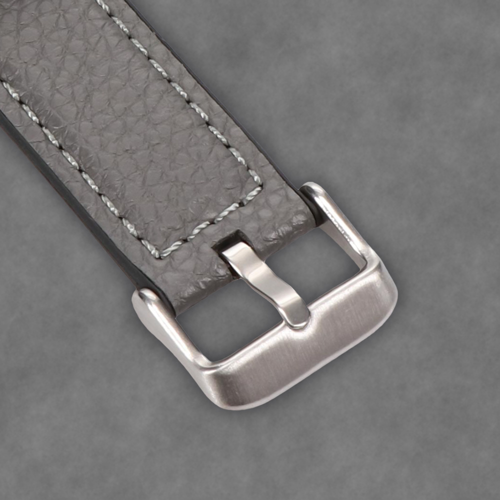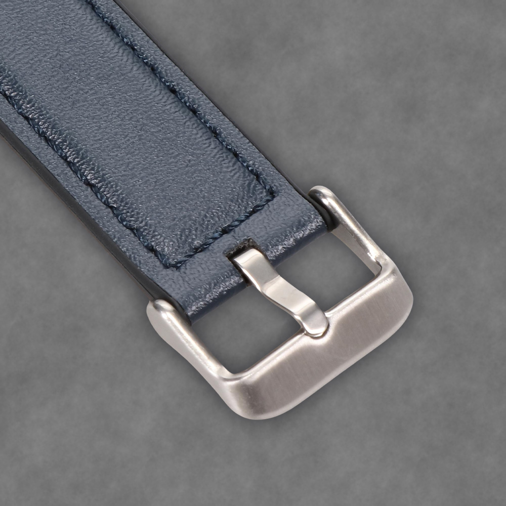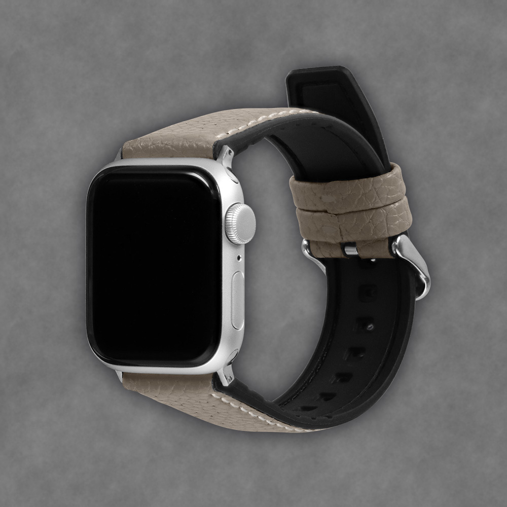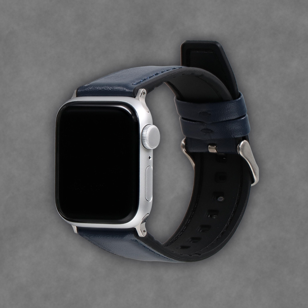 表地にシンプルかつスタイリッシュな印象のスムースレザーを用い、裏地にシリコンラバーを配して、レザーバンドの上品さとシリコンバンドの機能性を掛け合わせたハイブリッド構造のApple Watchバンドです。