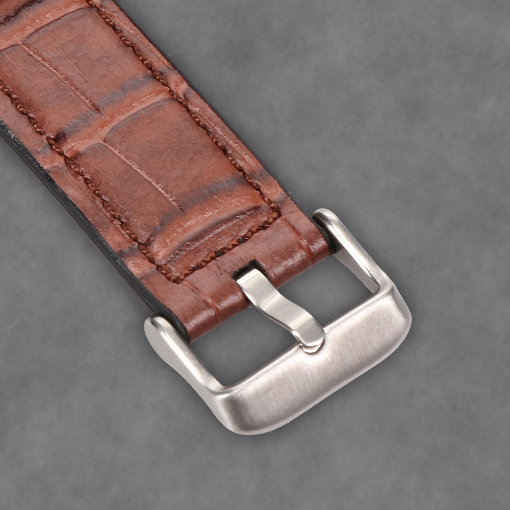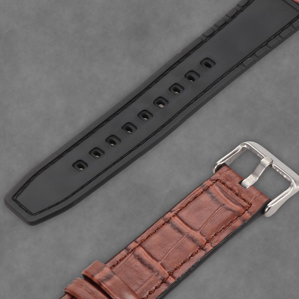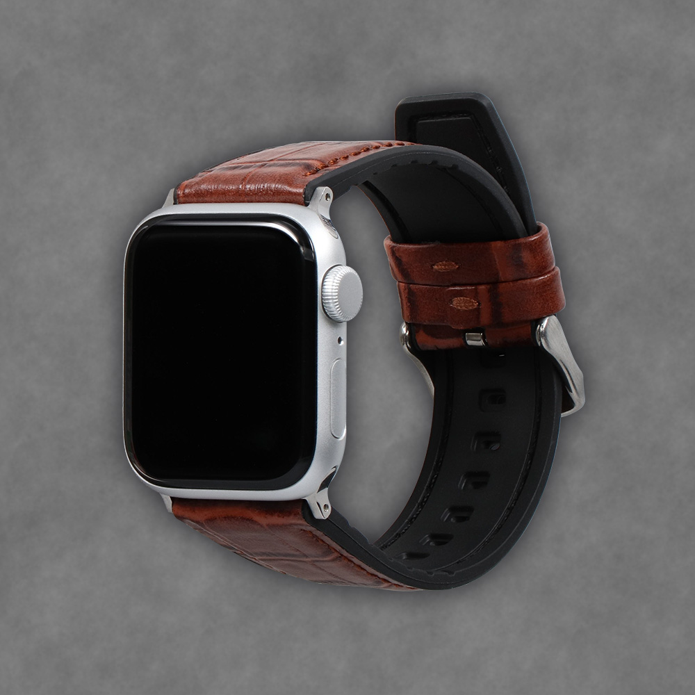 表地に高級感漂うクロコダイルの型押しレザーを用い、裏地にシリコンラバーを配して、レザーバンドの上品さとシリコンバンドの機能性を掛け合わせたハイブリッド構造のApple Watchバンドです。