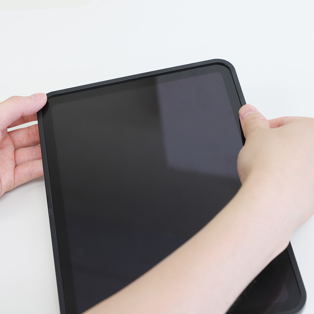 iPadにフレームをセットして画面保護ガラスを貼れば、カメラホールの位置合わせも簡単にできます。貼り付け作業が苦手な方にもおすすめです。
