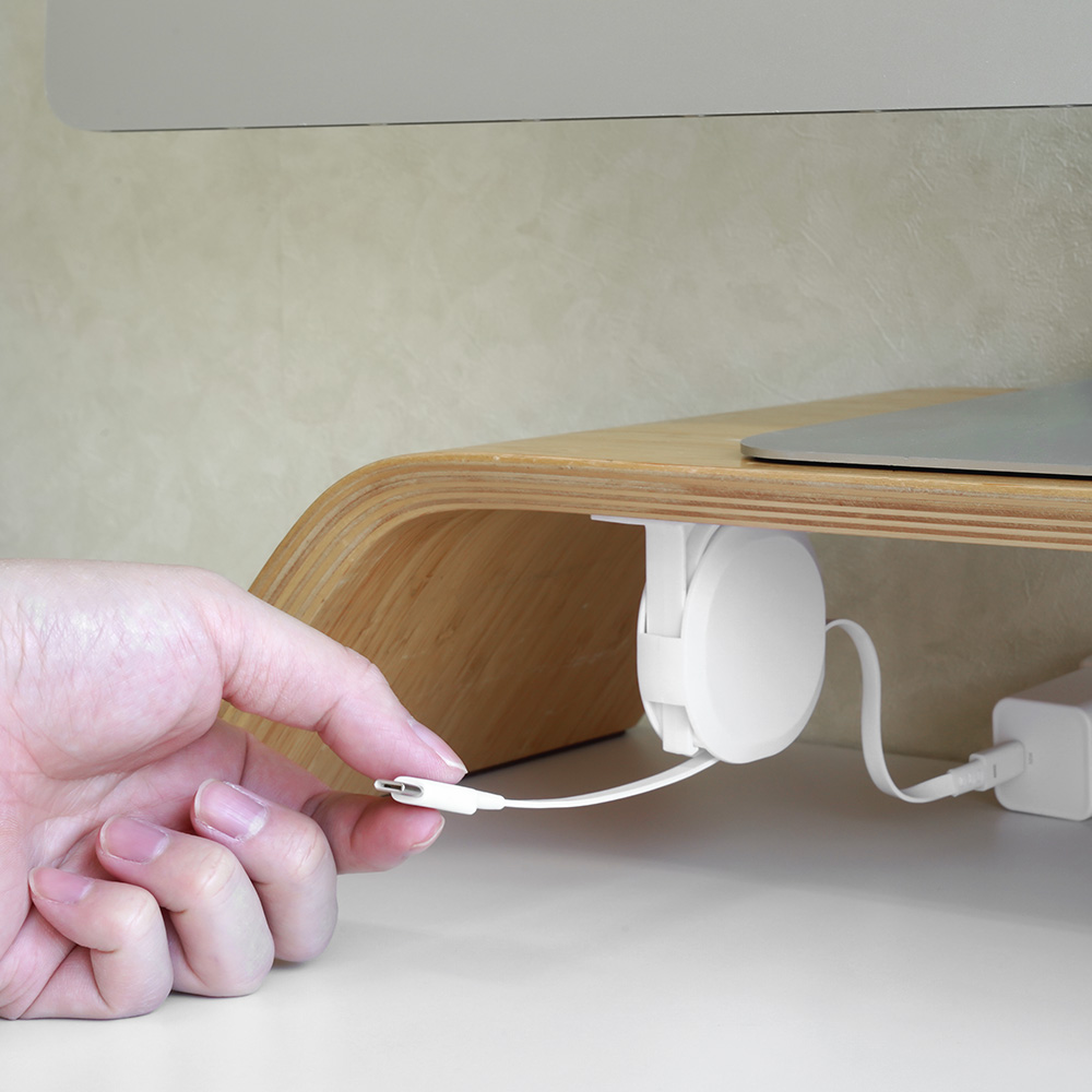 片方のケーブルだけが伸縮するからリール部分が邪魔にならず、デスク周りや外出先など多くのシーンで活躍します。手のひらに収まるサイズにケーブルを収納できるので持ち運びにも最適。