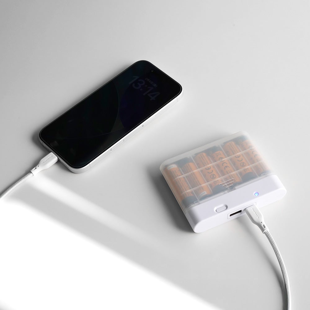 単3形のアルカリ乾電池または充電式ニッケル水素電池を6本セットするだけで使える、乾電池式のモバイルバッテリーです。電池を交換することで繰り返し使うことができます。
