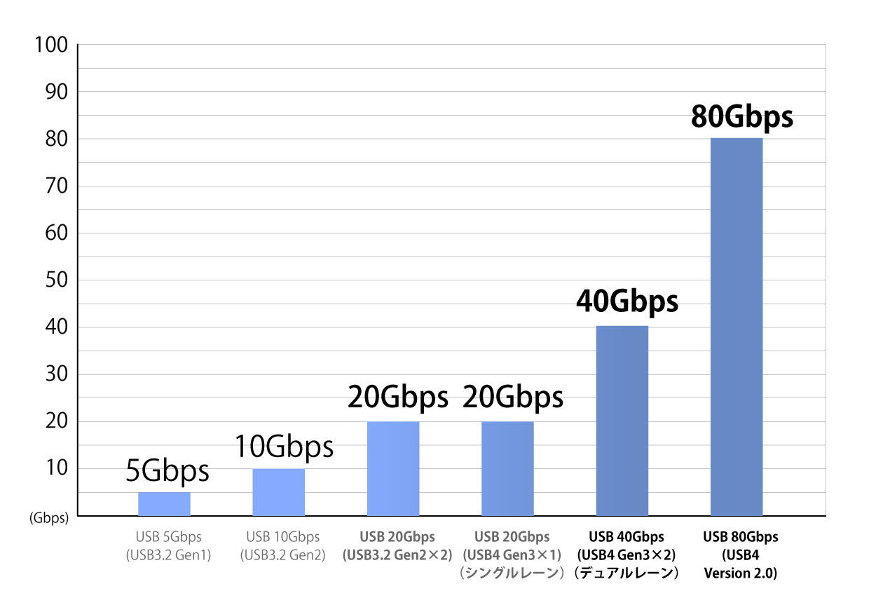 その中でも2019年に『USB 40Gbps(USB4 Version1.0)』(以下『USB 40Gbps』)が登場し、2022年に最新規格の『USB 80Gbps(USB4 Version2.0)』(以下『USB 80Gbps』)が発表されました。