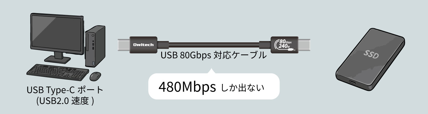たとえば、データ転送の場合『USB2.0』に対応している機器で『USB 80Gbps』ケーブルを接続しても、データ転送速度は最大480Mbpsとなります。