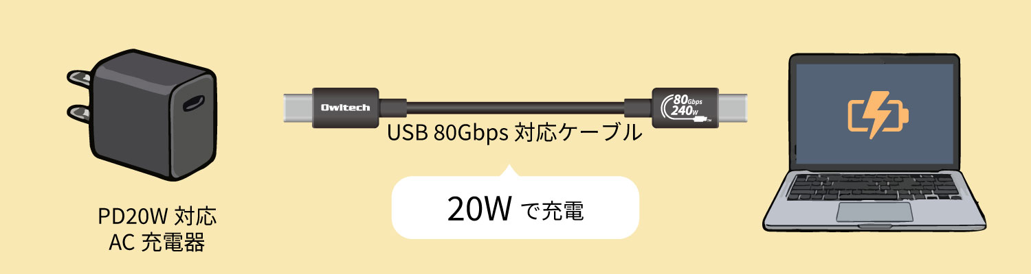また、充電時も同様に、最大20Wで充電できる機器で『USB 80Gbps』のケーブルを使う場合、100Wや240Wは流れず最大20W充電となり、必要以上に負荷をかけた充電には通常なりません。