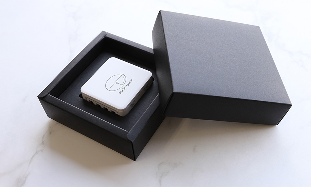 具体的なイメージを持っていただくため、オウルテックで1個2,200円(税込)のモバイルバッテリーに、UVカラー印刷でロゴ入れをした場合の例を紹介します。