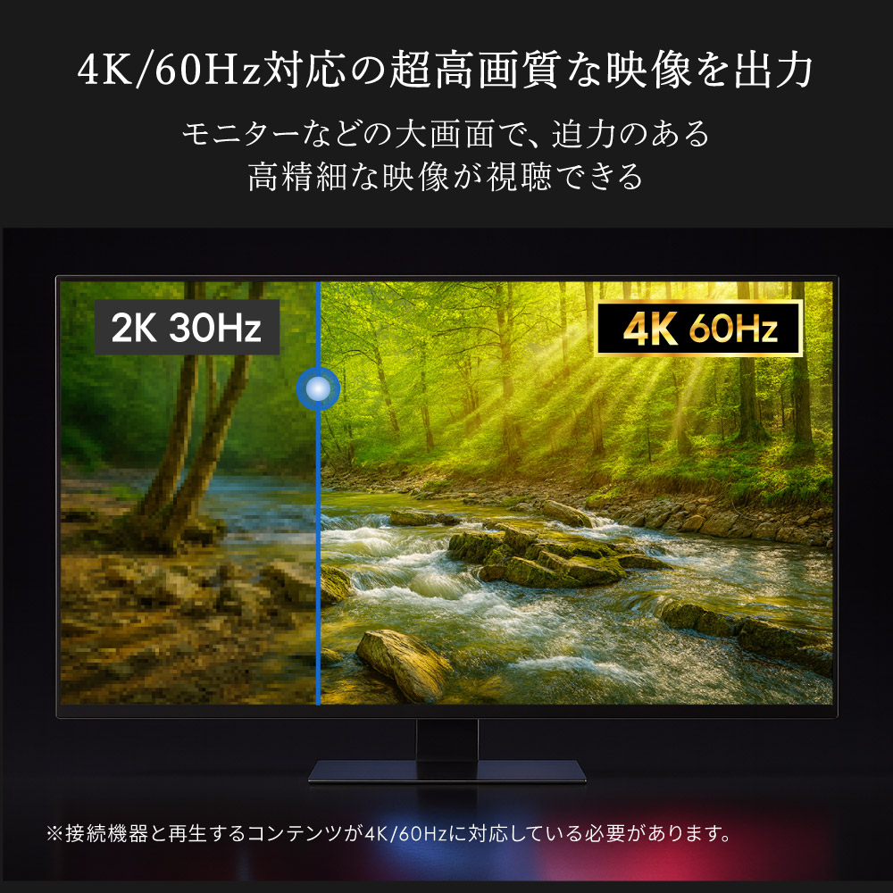 4K/60Hzの高解像度映像を滑らかに出力でき、外部モニターやプロジェクターへの接続も快適です。