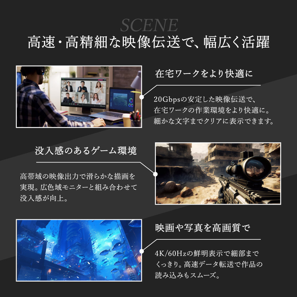 USB4 Gen2×2規格に準拠し、最大20Gbpsの超高速通信を実現しました。