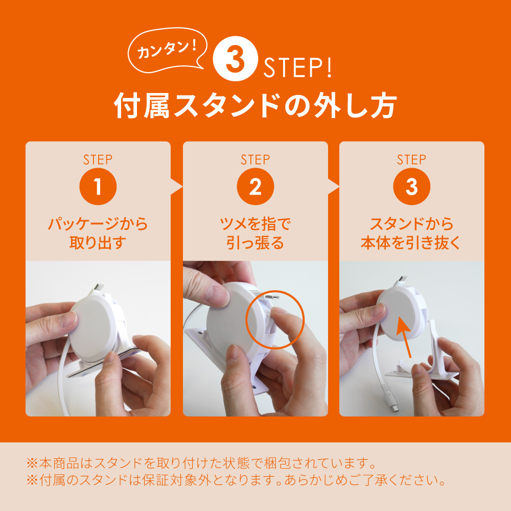 本体を付属スタンドで固定しておけば、いつもの場所からサッと引き出して使える。デスク上をスッキリ整頓でき、毎日の充電が快適にスムーズに行えます。