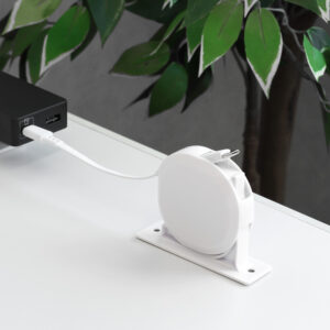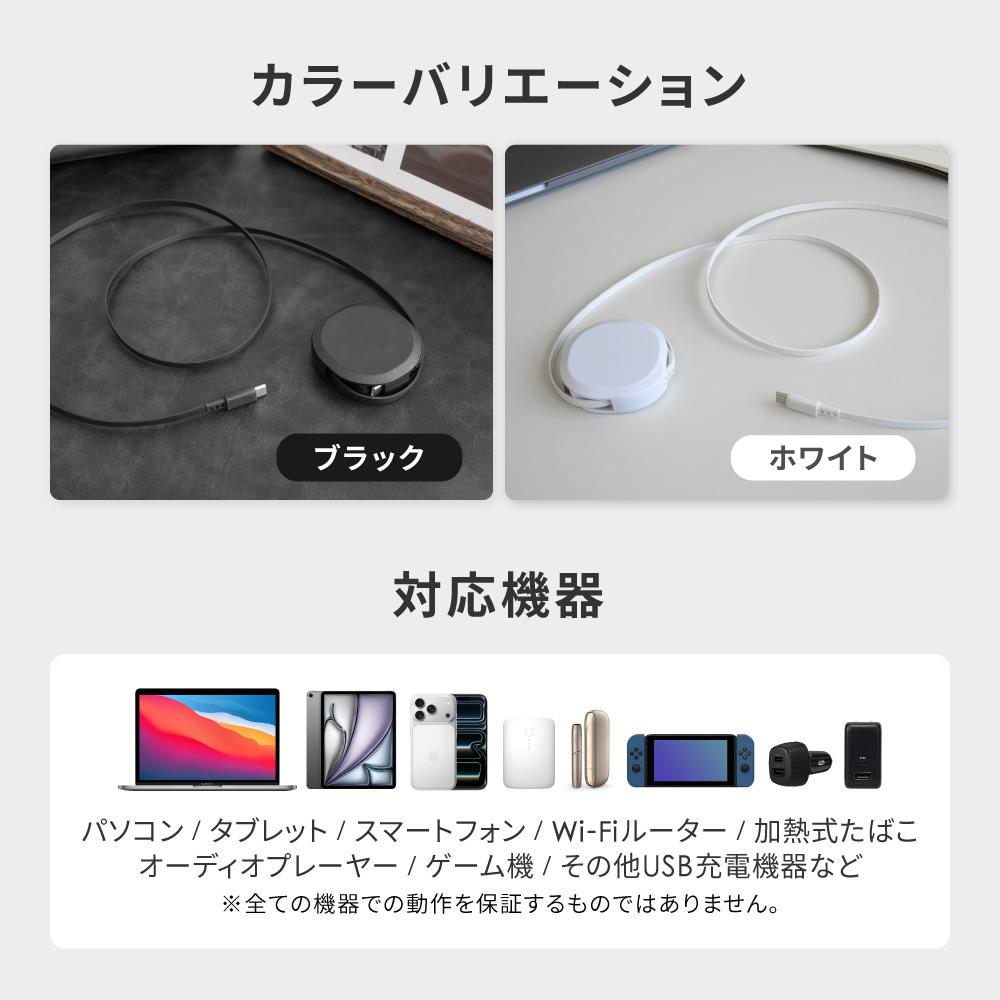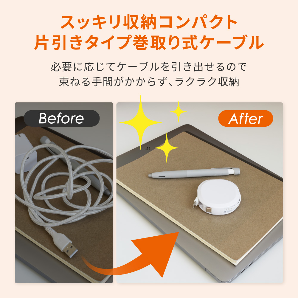 片方のケーブルだけが伸縮するからリール部分が邪魔にならず、デスク周りや外出先など多くのシーンで活躍します。手のひらに収まるサイズにケーブルを収納できるので持ち運びにも最適。