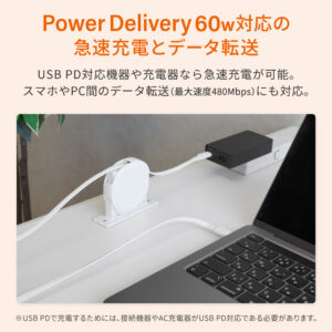 - 最大60W充電対応(20V/3A)、USB PD(Power Delivery)対応