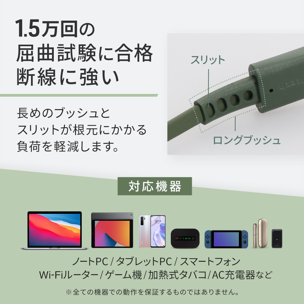 コネクターやケーブルの付け根部分をロングブッシュ構造にすることで折り曲げ時の角度を緩和。根元にかかる負荷を軽減し、15000回以上の折り曲げに耐える強化構造を実現しました。