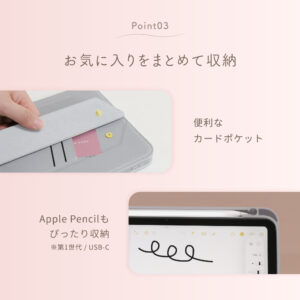 Apple Pencil(第1世代 / USB-C)を収納できるペンホルダー付きです。ペンを立てて置けるスペースもあり、デスク上でも扱いやすくなります。