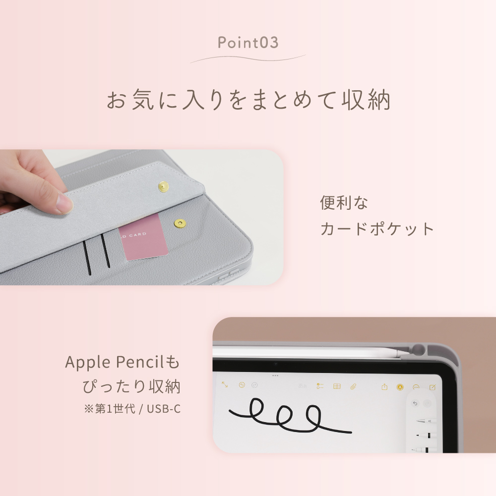 滑りにくいレザー素材を使用し、スタンド・オートスリープ・ペンホルダー・カードポケットなど、便利な機能をまとめたiPadケースです。