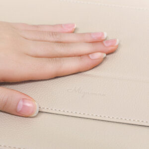 カバー部分には、レザーのような高級感がありながら、適度に滑りにくいグリップレザー(合成皮革)を採用しました。カバーを閉じて持ち歩く際の落下リスクを軽減できます。