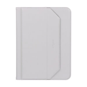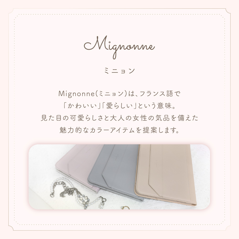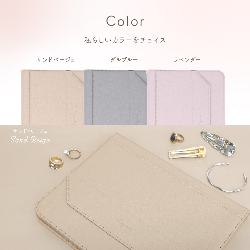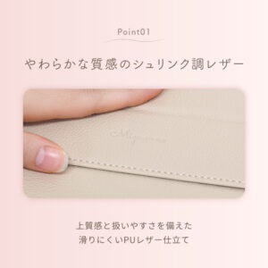 カバー部分には、レザーのような高級感がありながら、適度に滑りにくいグリップレザー(合成皮革)を採用しました。カバーを閉じて持ち歩く際の落下リスクを軽減できます。
