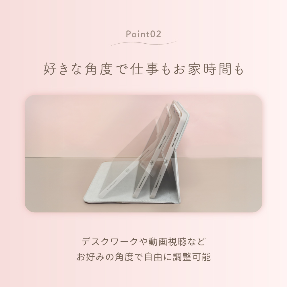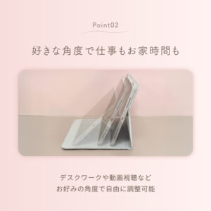 横置き時にお好みの角度に調整でき、動画を見たり作業したりと、シーンに合わせて無理のない姿勢で使えます。