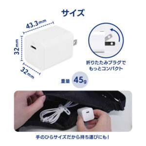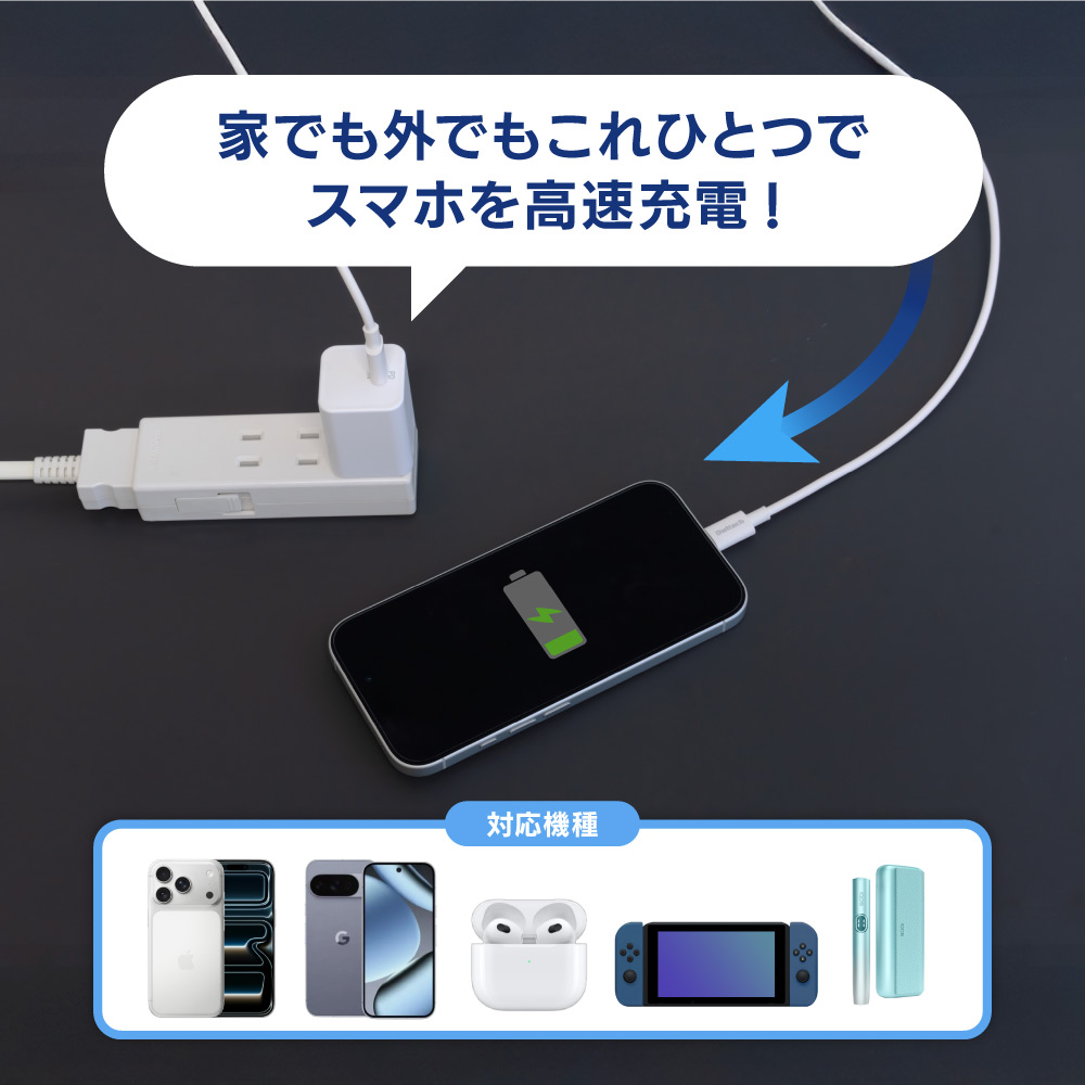 最大PD20W出力に対応した「スマホ充電器」としておすすめのAC充電器です。もちろん、スマートフォン以外にもタブレットやUSB機器の充電にもおすすめです。