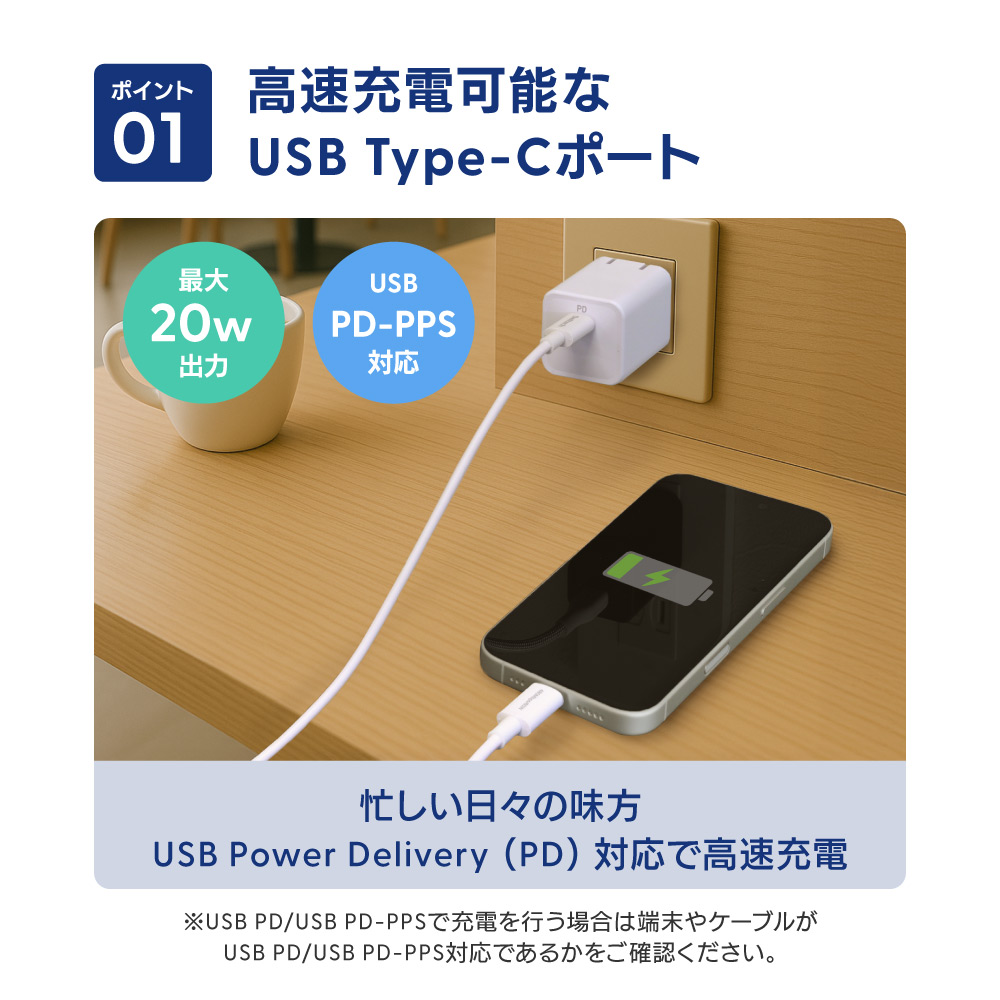 USB PD(Power Delivery)に対応し、最大20Wの急速充電が可能です。スマートフォンやタブレットの充電に最適です。