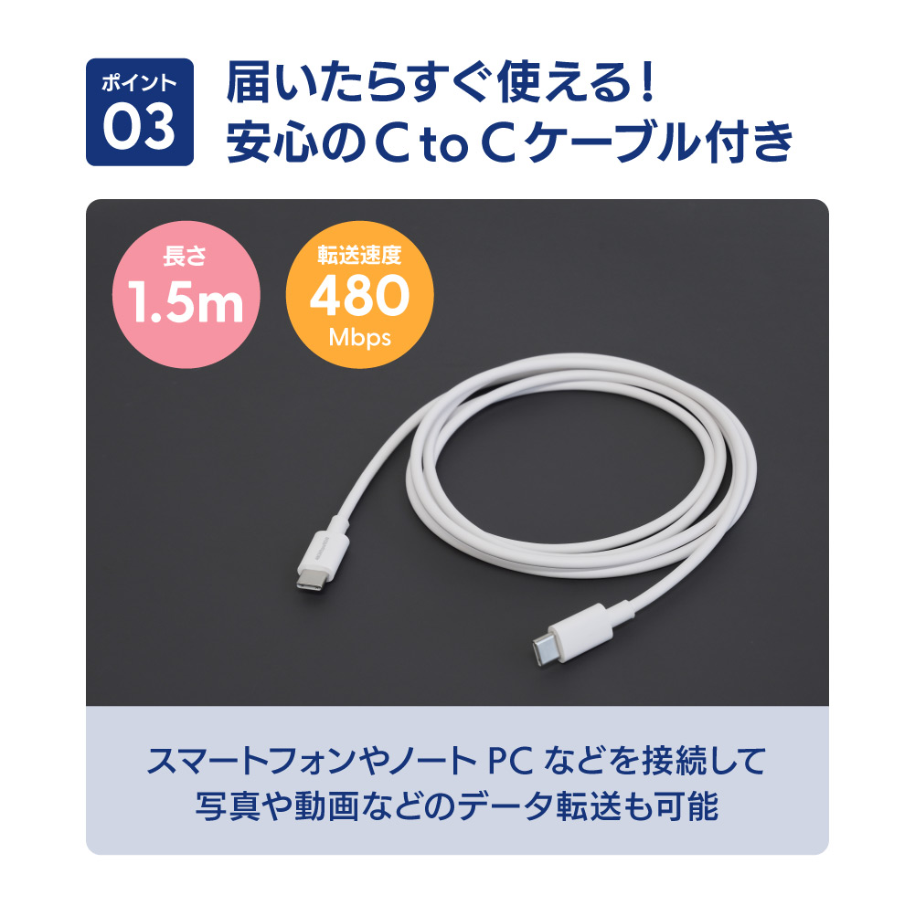付属のケーブルは1.5mと取り回しやすい長さ。対応機種であればご購入後すぐにPD充電ができます。