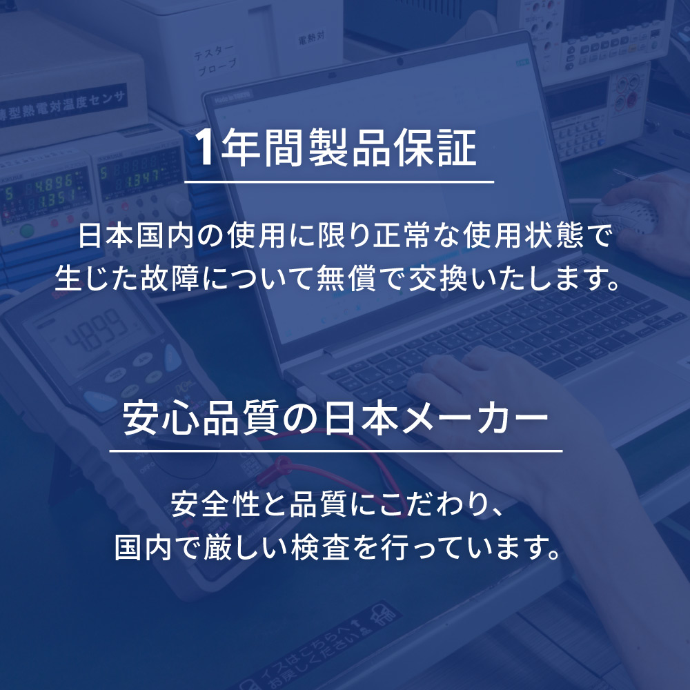 本製品は1年保証がございます。ご使用中に万が一不具合などが発生した場合、保証期間内であれば無償で交換を保証いたします。お客様が安心して長くお使いいただける製品品質と併せて、サポート体制にも力を入れております。