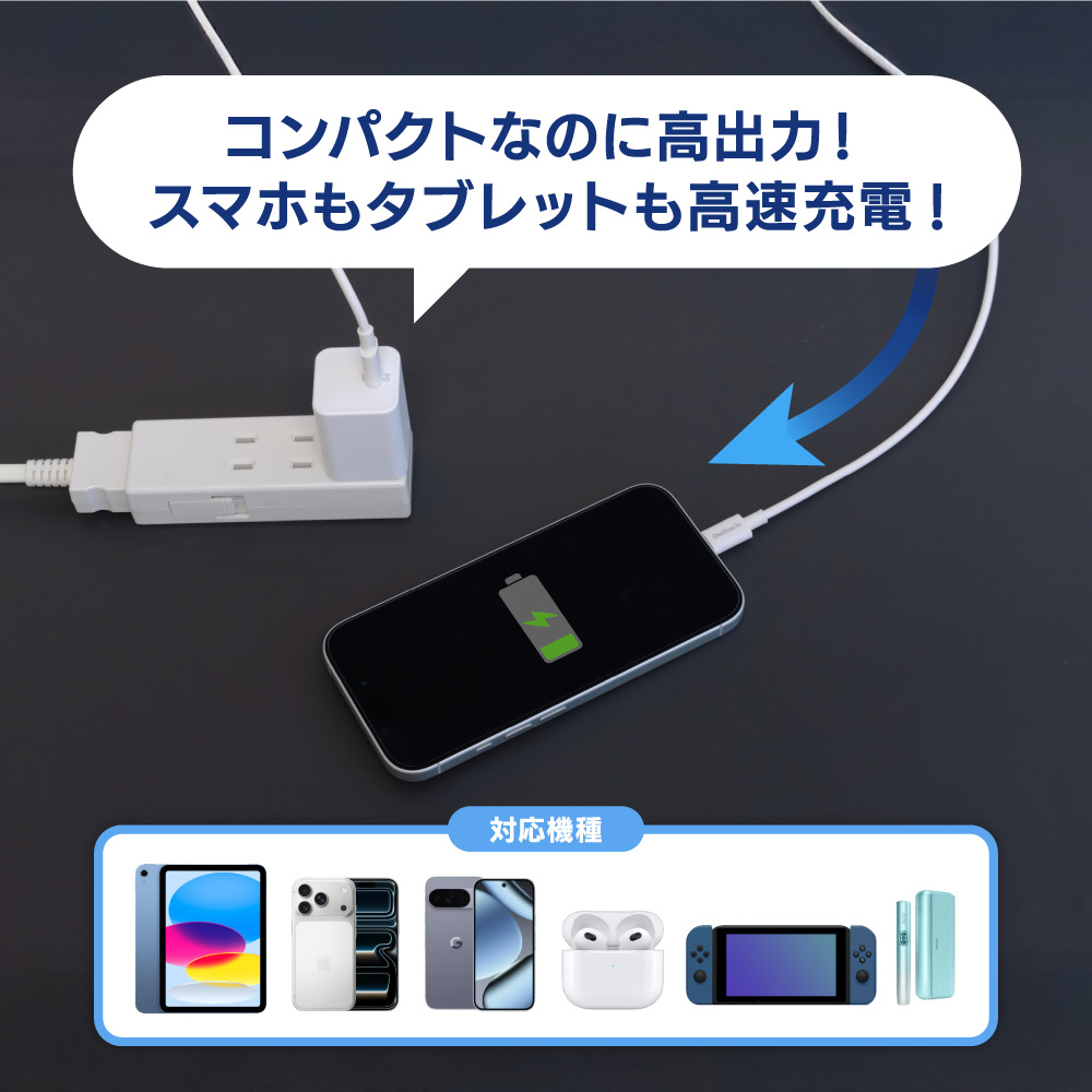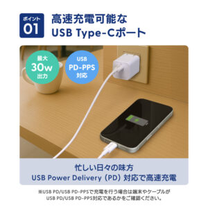 USB PD(Power Delivery)に対応し、最大30Wの急速充電が可能です。スマートフォンをはじめ、タブレットやその他USB機器も充電できます。