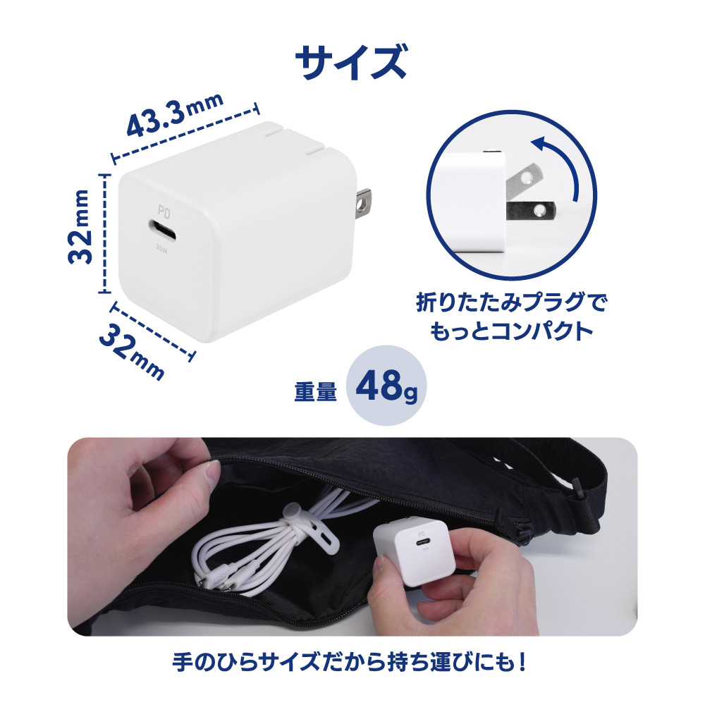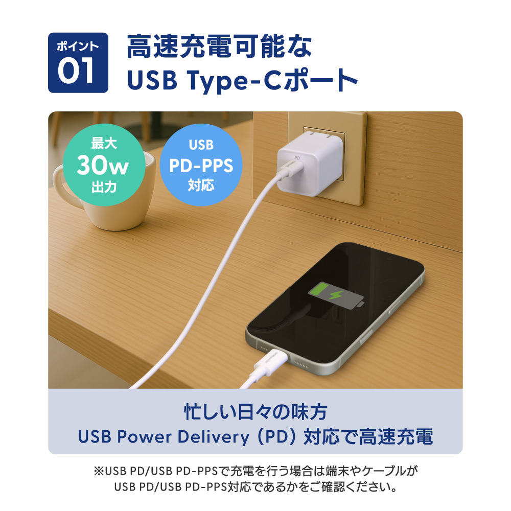 最大PD30W出力に対応した「スマホ充電器」としておすすめのAC充電器です。もちろん、スマートフォン以外にもタブレットやUSB機器の充電にもおすすめです。