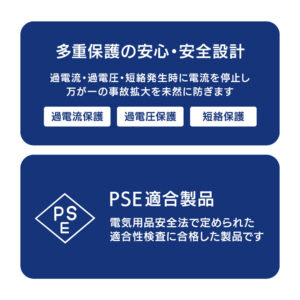 日本の法律である「電気用品安全法」で定められた検査を実施したPSE適合製品です。安心・安全にご使用いただけます。