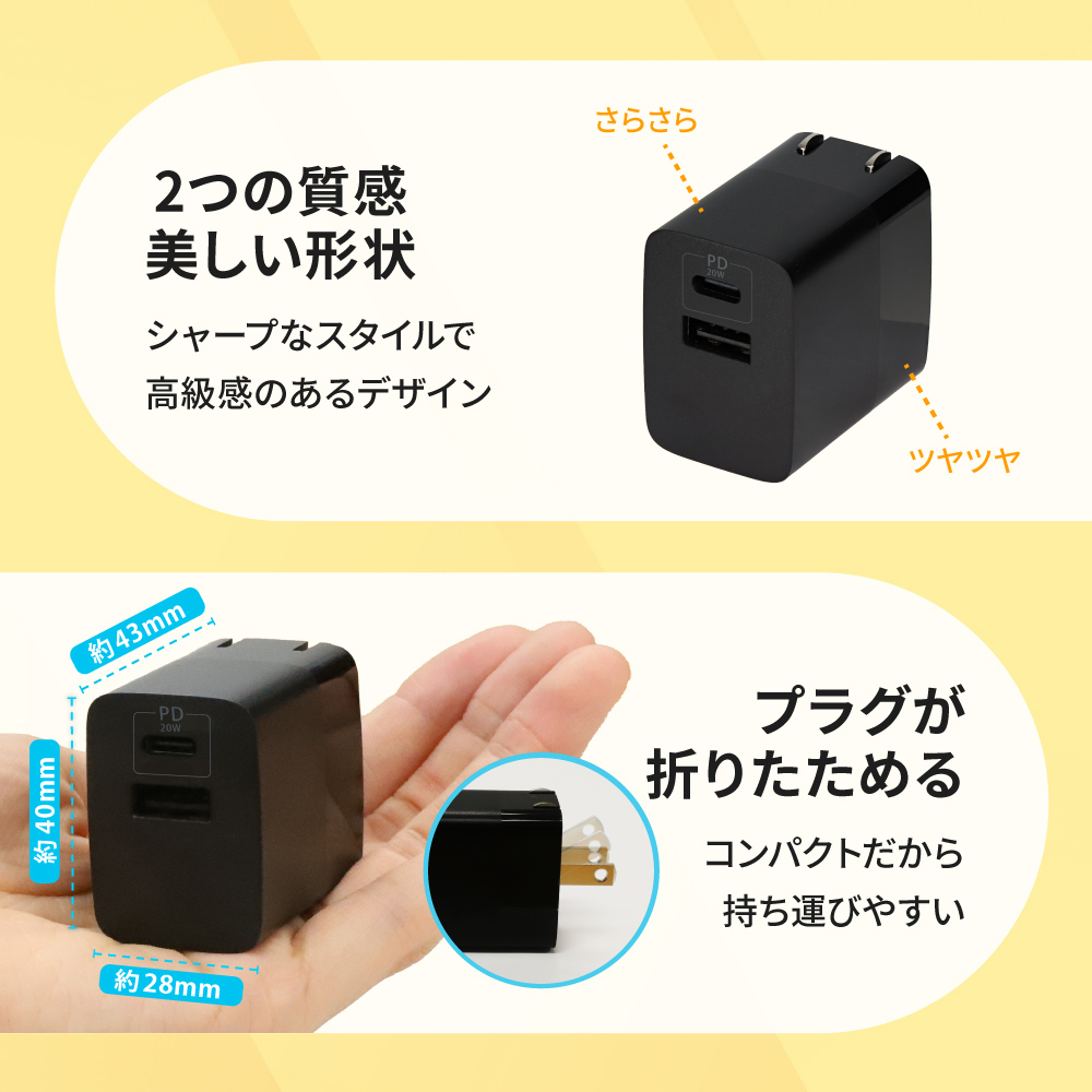 プラグ側は光沢のある質感で、ポート側はマットな質感と、2つの質感が1つになったAC充電器です。小さなサイズですが、最大20Wでの充電が可能です。