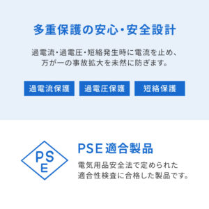 日本の法律である「電気用品安全法」で定められた検査を実施したPSE適合製品です。安心・安全にご利用いただけます。