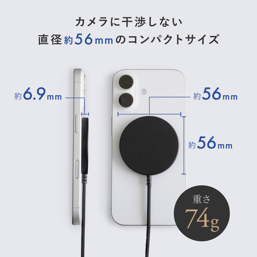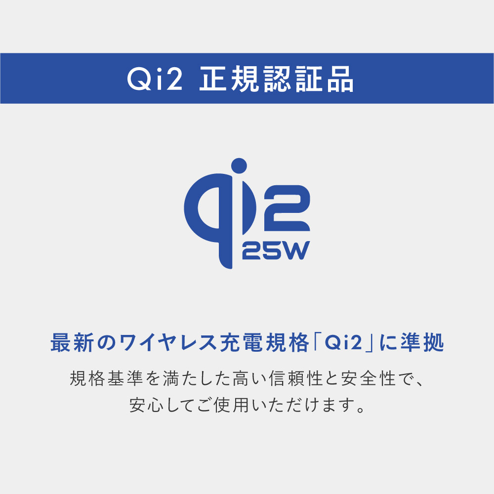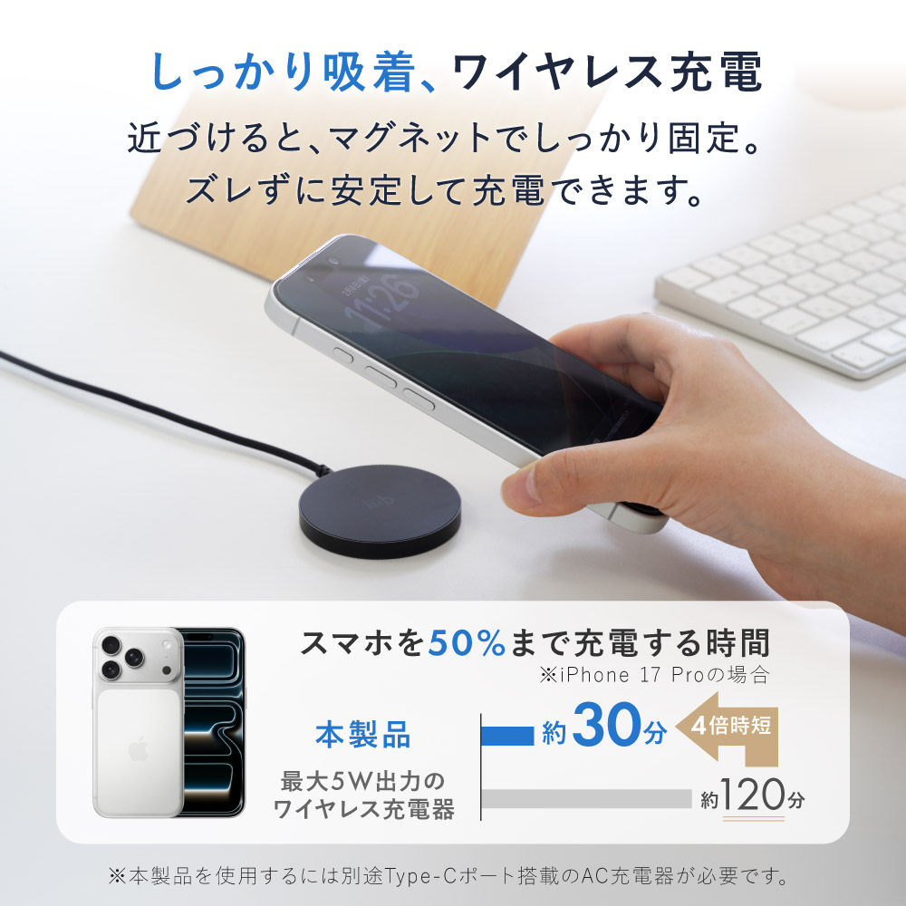 本製品はQi2 25W規格対応のケーブル一体型ワイヤレス充電器です。iOS26以降のiPhone 16、iPhone 17シリーズなどで最大25Wの高速なワイヤレス充電が可能です。