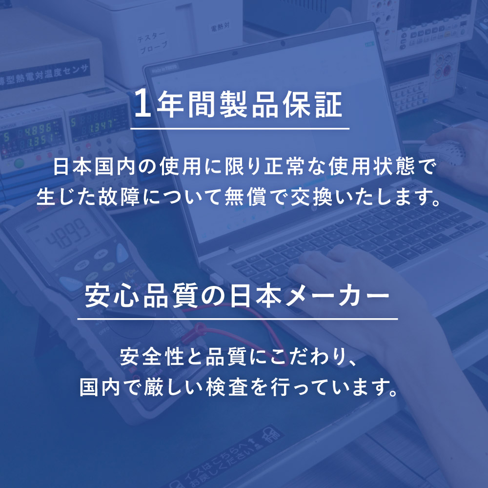 本製品は1年保証がございます。ご使用中に万が一不具合などが発生した場合、保証期間内であれば無償で交換を保証いたします。お客様が安心して長くお使いいただける製品品質と併せて、サポート体制にも力を入れております。