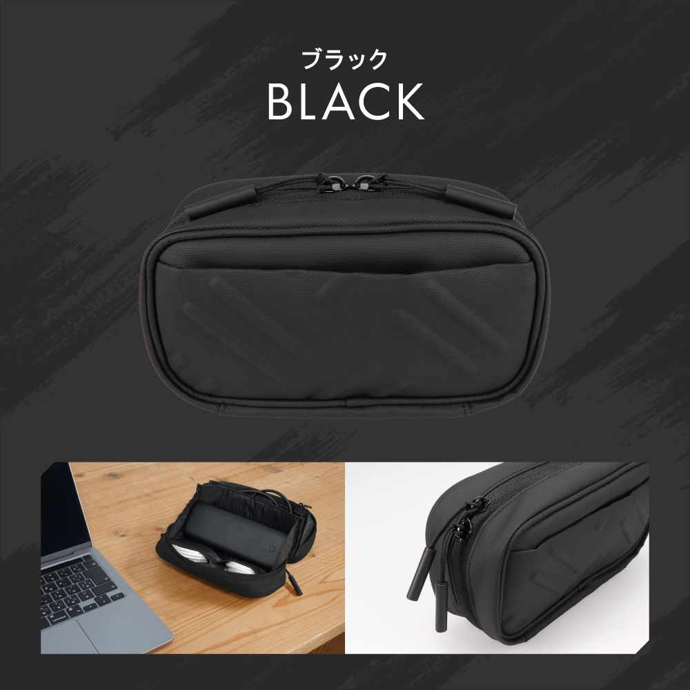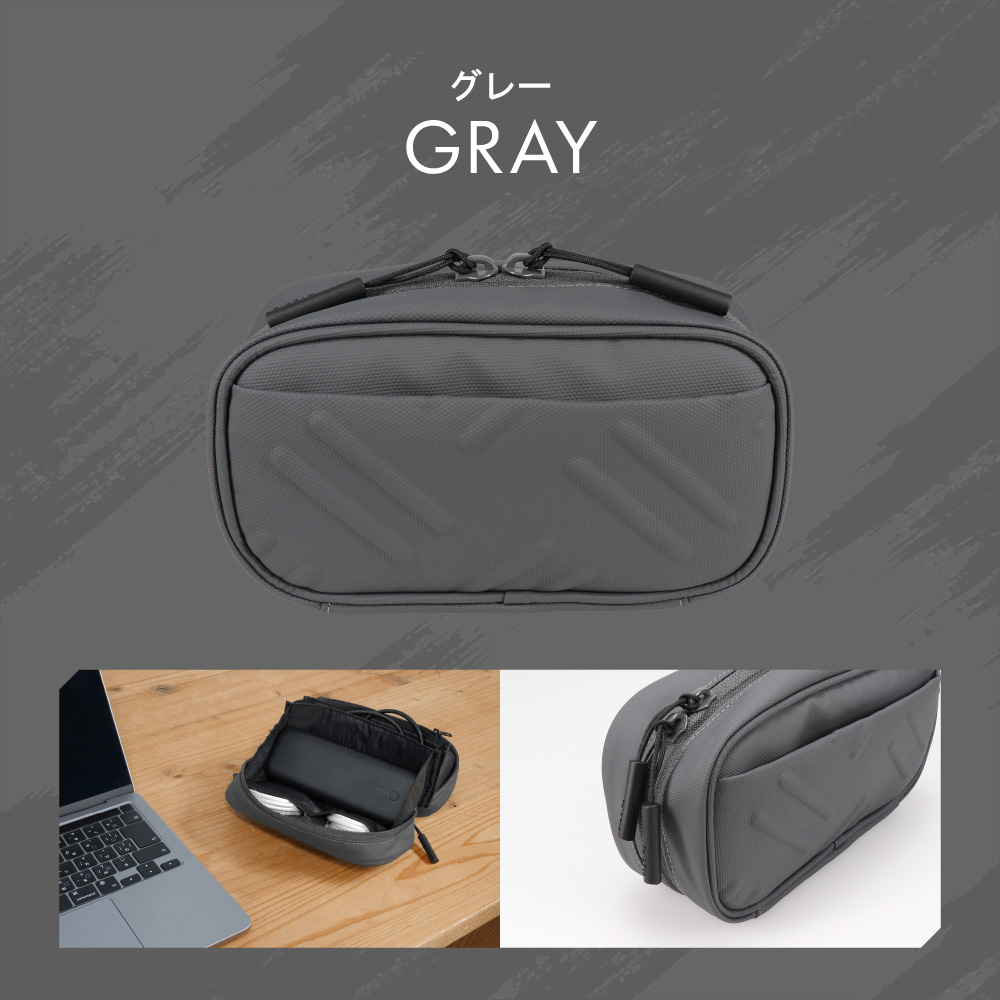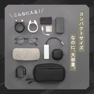 本製品は収納したものがひと目で確認できる、パノラマオープン設計のガジェットポーチです。コンパクトなサイズ感ながら、大容量で使い勝手も抜群です。