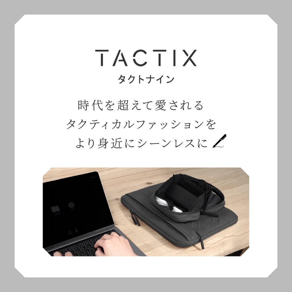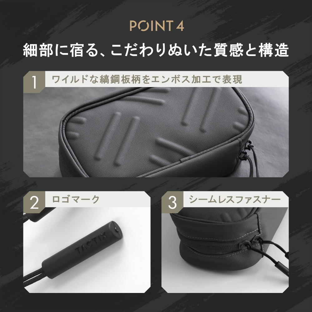 TACTIXシリーズのコンセプト「アーバンミリタリー」を意識した縞鋼板柄(しまこうはんがら)をあしらっています。リュックなどから取り出す際に手触りで発見しやすいメリットを併せ持ちます。