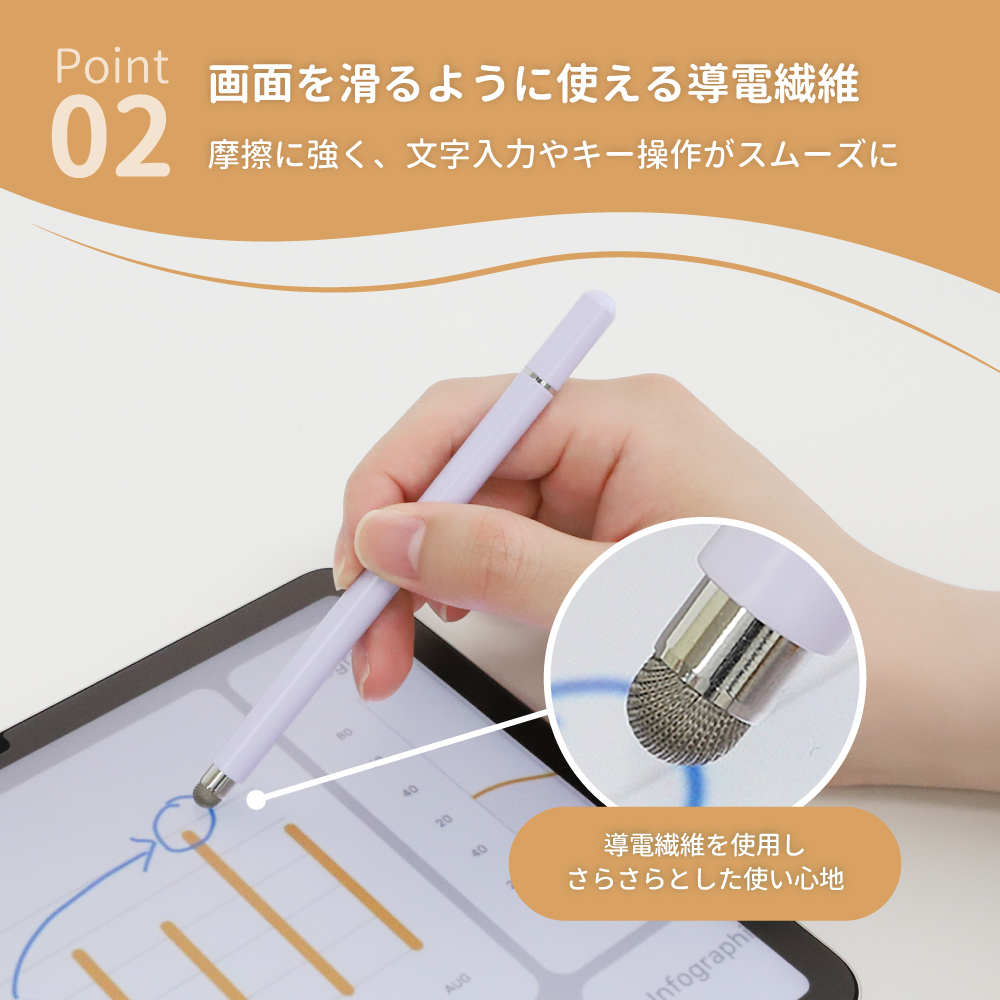 金属やカーボンなどで作られた特殊な繊維で、画面を滑るようにスムーズな操作が可能です。タッチ時にカチカチと音がしないため静かな場所でもお使いいただけます。