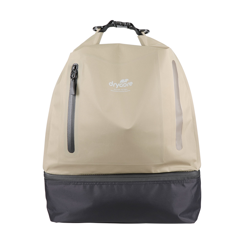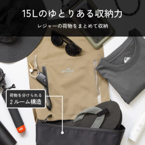 メイン収納とは別に仕切られたスペースを備えた2ルーム構造で、濡れたものと乾いたもの、衣類と小物などを分けて収納できます。15L容量で旅行やレジャーにも便利です。