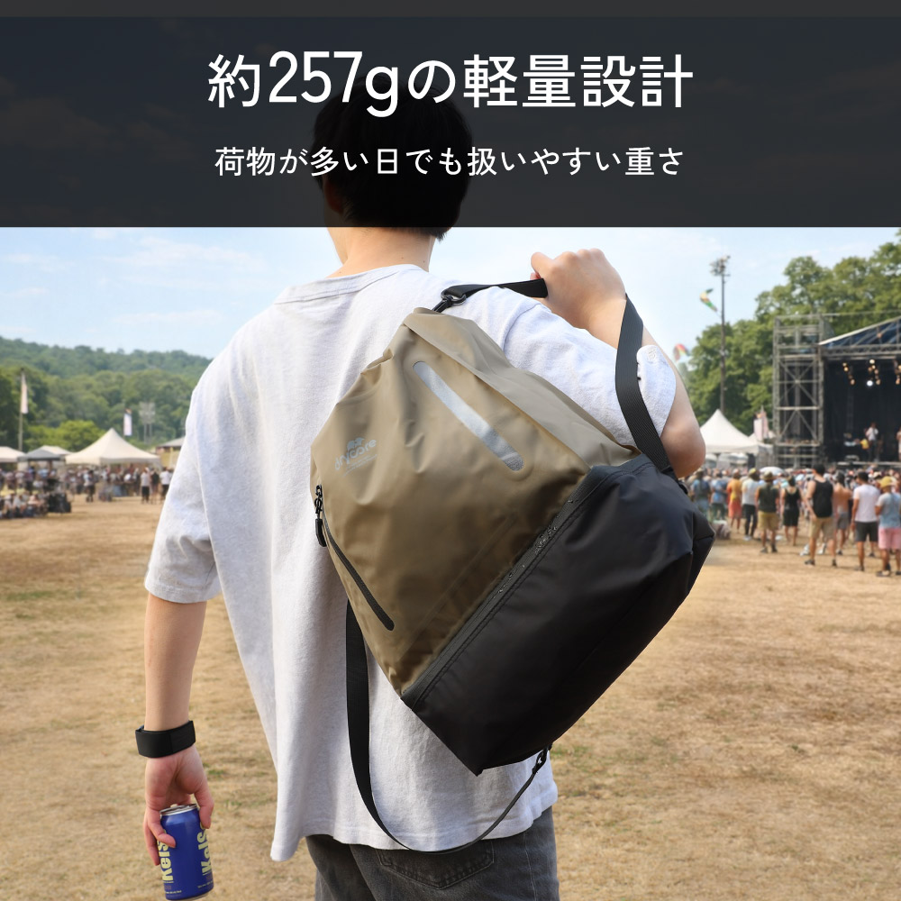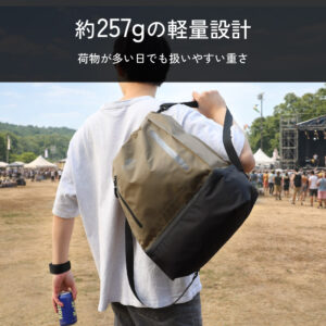 約257gと軽量で、アウトドアやフェスなど荷物が増えやすいシーンでも負担になりません。撥水性のある軽量素材を採用し、使い勝手と耐久性を両立しています。