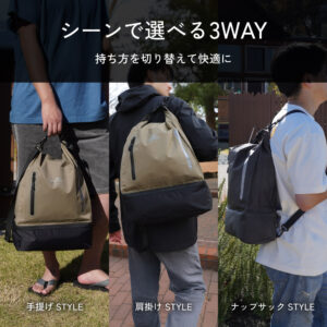 手さげ・肩掛け・ナップサックの3スタイルに切り替えられるため、荷物の量やシーンに合わせて最適な持ち方を選べます。
