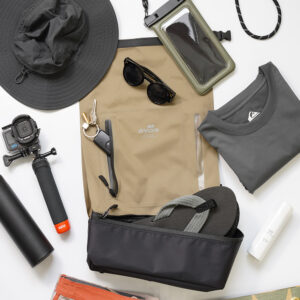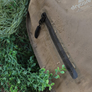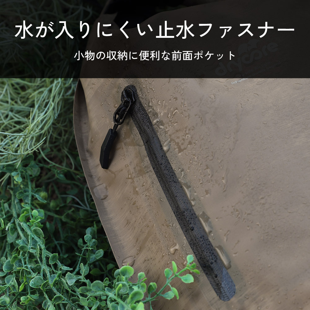 前面には止水ファスナー付きのポケットを備えており、スマートフォンや鍵などの小物を分けて収納できます。濡らしたくない小物を整理できる便利なポケットです。