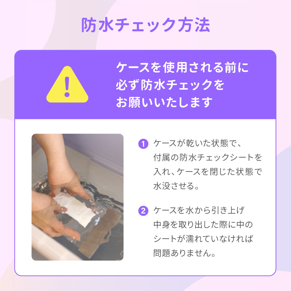 使用前に防水チェックができる「防水チェックシート」が付属しています。製品台紙の防水チェック方法に沿って、内部の浸水がないかをご確認いただけます。