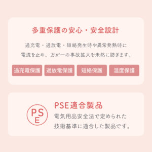 日本の法律である「電気用品安全法」で定められた検査を実施したPSE適合製品です。安心・安全にご利用いただけます。