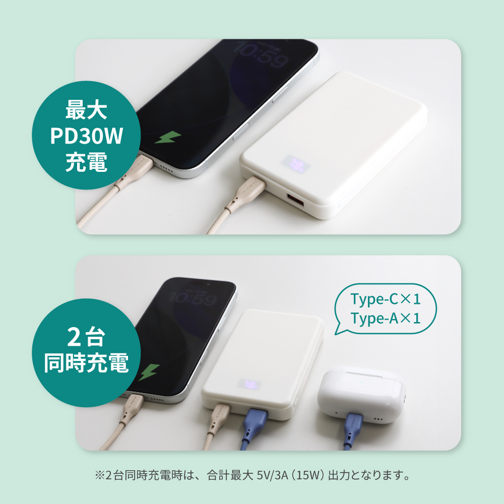 USB Type-CポートとUSB Type-Aポートを搭載し、合計最大5V/3A出力で2台の機器を同時に充電できます。スマートフォンとワイヤレスイヤホンなど、2つのデバイスを一度に充電できる便利な仕様です。