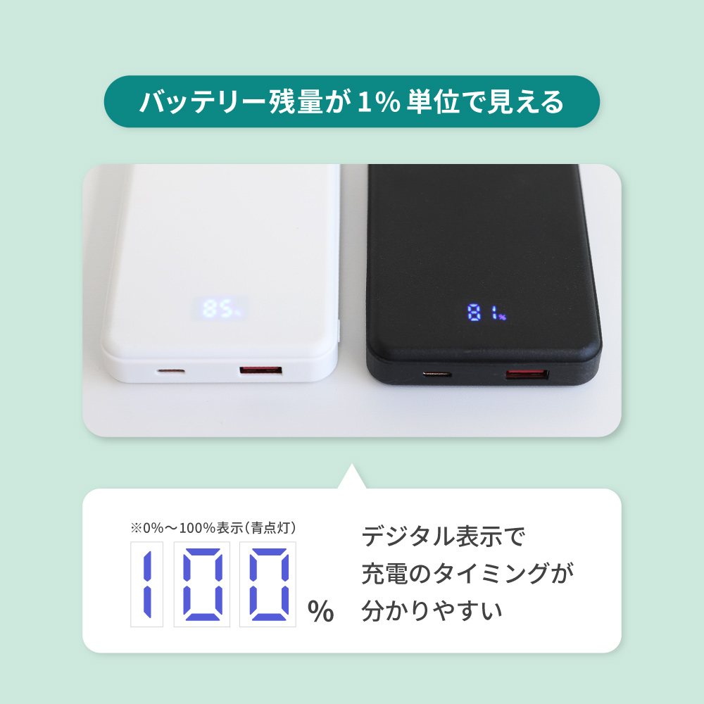 バッテリー残量を1%単位で確認できるデジタル表示を搭載。LEDランプ数の残量表示よりもわかりやすく充電残量を確認できます。